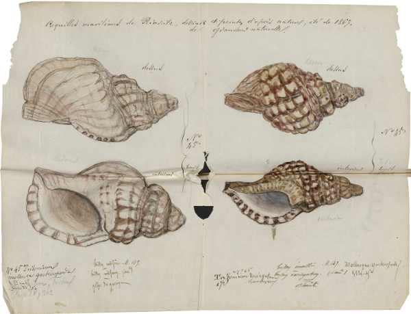 Le manuscrit d’histoire naturelle est un épais volume de 1002 pages, superbement relié lui aussi, qui à la différence du précédent apparaît comme très hétérogène dans son contenu et dans son agencement. On y trouve une juxtaposition d’un ensemble de brochures, numérotées de 1 à 9, mais dont certaines sont presque vides. Ce sont : Poissons (brochure 9), Mollusques (b.8), Quadrupèdes, Ovipares, Serpents (b. 7), Iconographie, Ornithologie (b.6), Fossiles (b.5), Mammifères (b.4), Crustacés (b.3), Botanique (b. 2. Vide !), Insectes (b. 1). L’ensemble a été constitué en 1867-1868.
