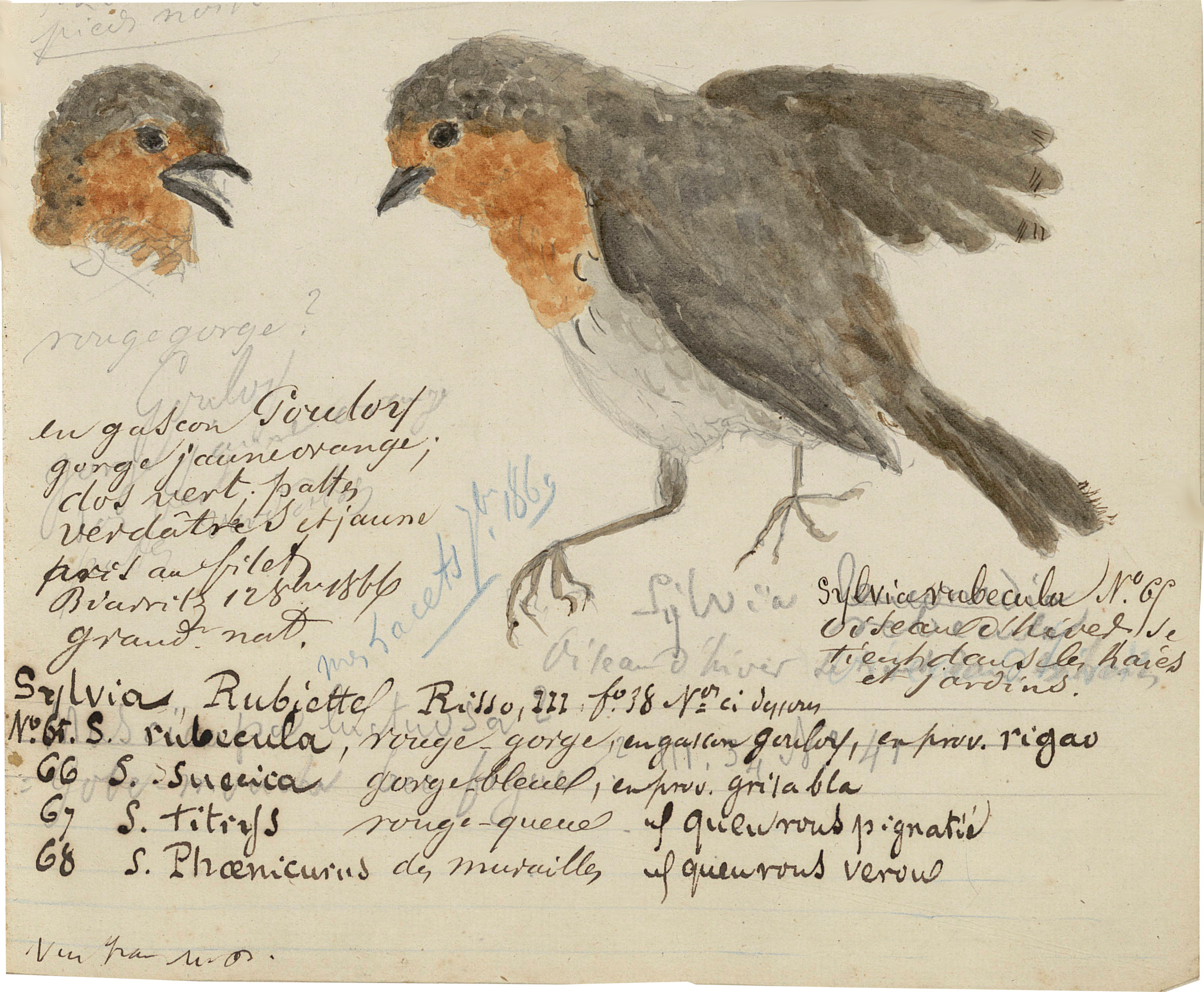 Le manuscrit Ornithologie est un gros document truffé de dessins et de notes. Il faut noter l’avant dernière planche, n° 68, consacrée à l’empaillement des oiseaux. A cette époque, en effet, la règle était de disposer d’un animal mort afin d’examiner soigneusement toutes les caractéristiques ornithologiques. Le fusil était donc le premier instrument scientifique utilisé par les naturalistes. Ensuite venait l’empaillage et la mise en situation de l’oiseau la plus naturelle possible. La ville de Biarritz et le Museum de Bayonne possèdent ainsi de très importantes collections d’oiseaux naturalisés.