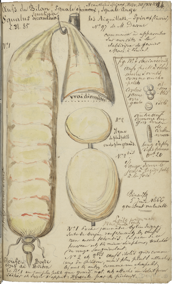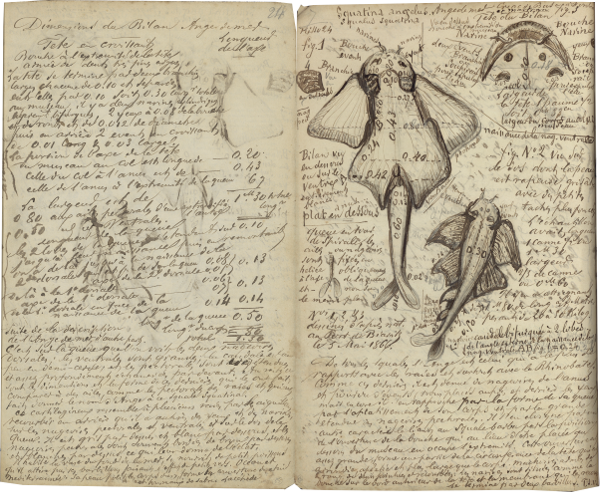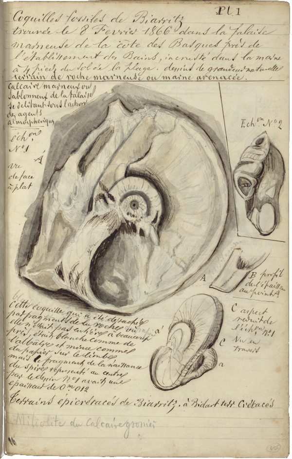 Extrait du feuillet 263 sur lequel apparait (en haut à gauche) la clione issue des mers froides (Clio australis). L’annotation D223-10 fait référence à un catalogue d’Ulysse Darracq introuvable aujourd’hui.