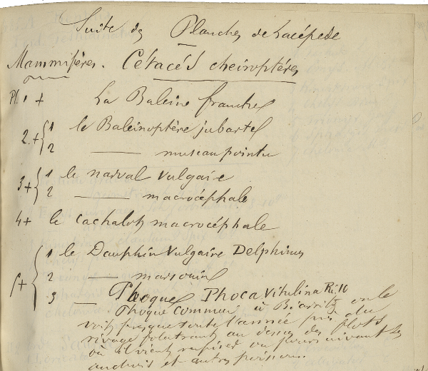 | Extrait de la classification de Lacépède, recopiée par Ducourrau, et classant les cétacés parmi les mammifères : baleine, narval, cachalot, dauphin et phoque que Ducourrau décrit comme « commun à Biarritz, on le voit presque toute l’année près du rivage folâtrant au dessus des flots (…) » |