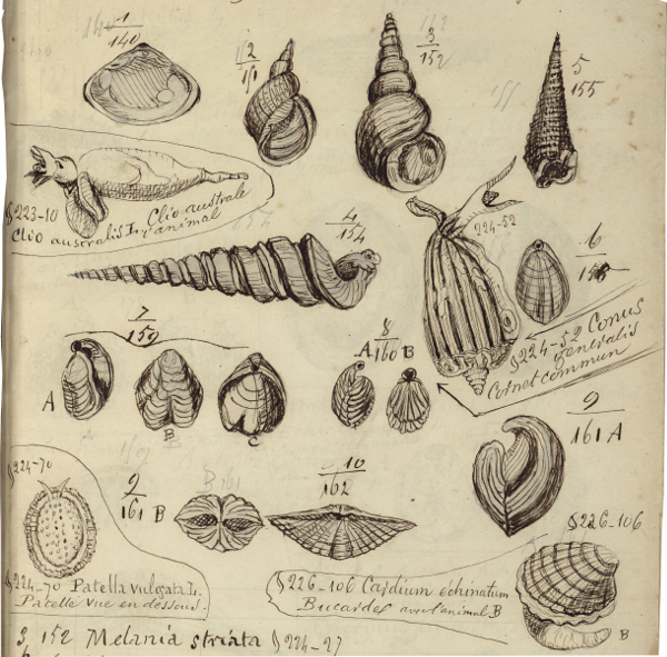 Les mollusques sont également représentés, entre les céphalopodes (seiches et œufs), gastéropodes (escargots), les bivalves… à travers quelques dessins et une longue liste de genres et d’espèces. Parmi les très nombreuses espèces dessinées, se trouve sur le feuillet 263 une clione (ou papillon de mer, gastéropode sans coquille), espèce normalement présente dans les mers froides de l’hémisphère nord. L’a-t-il réellement rencontré ou dessiné à partir d’une illustration ?