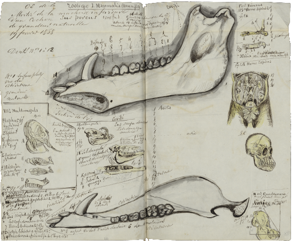 Extrait des feuillets sur les mammifères : mâchoires de porcs, contenus de l’abdomen humain, crâne d’éléphant, de porc, de singe…