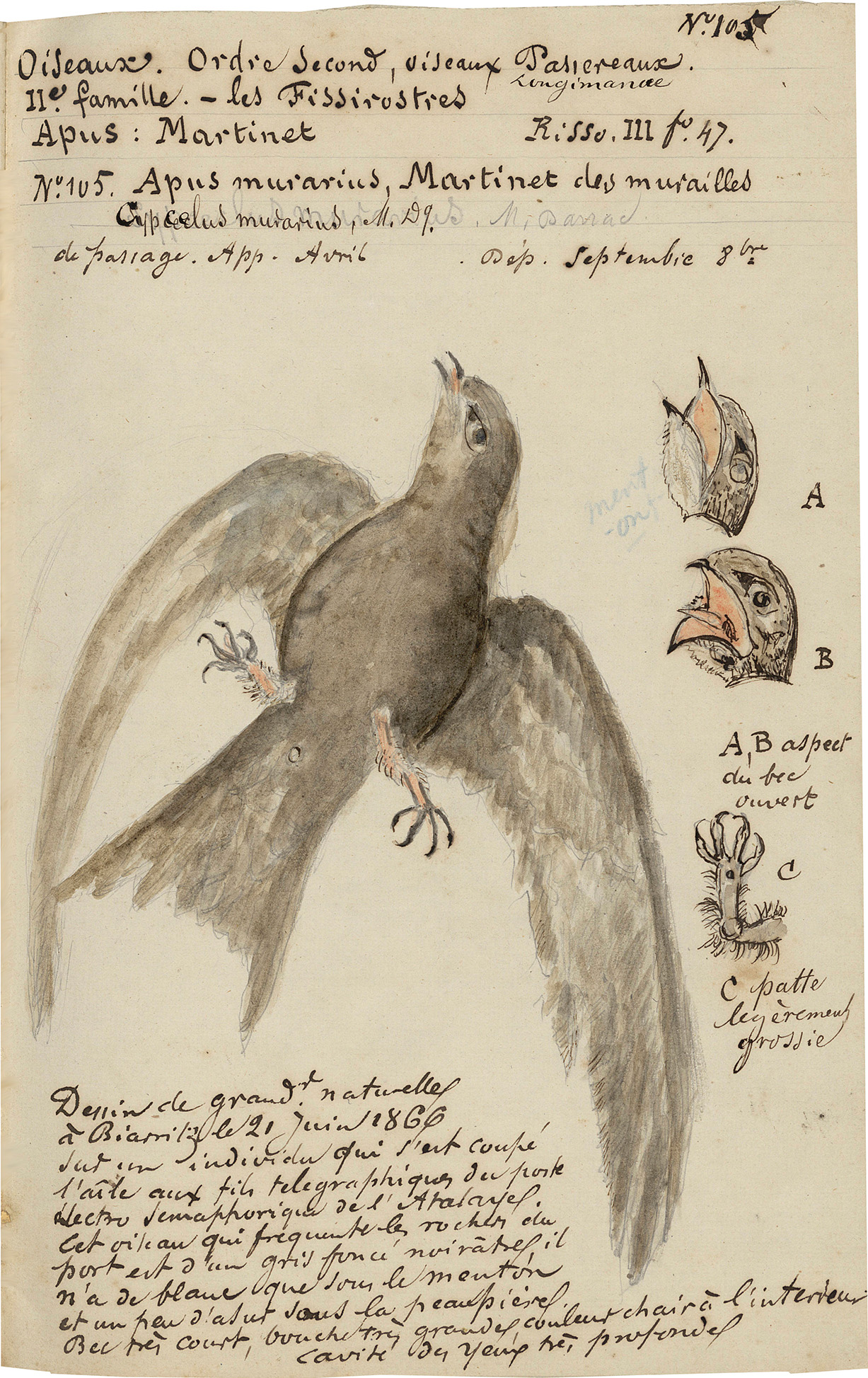 Dessin de grandeur naturelle à Biarritz le 21 juin 1866 sur un individu qui s’est coupé l’aile aux fils télégraphiques du poste électro sémaphorique de l’Atalaye