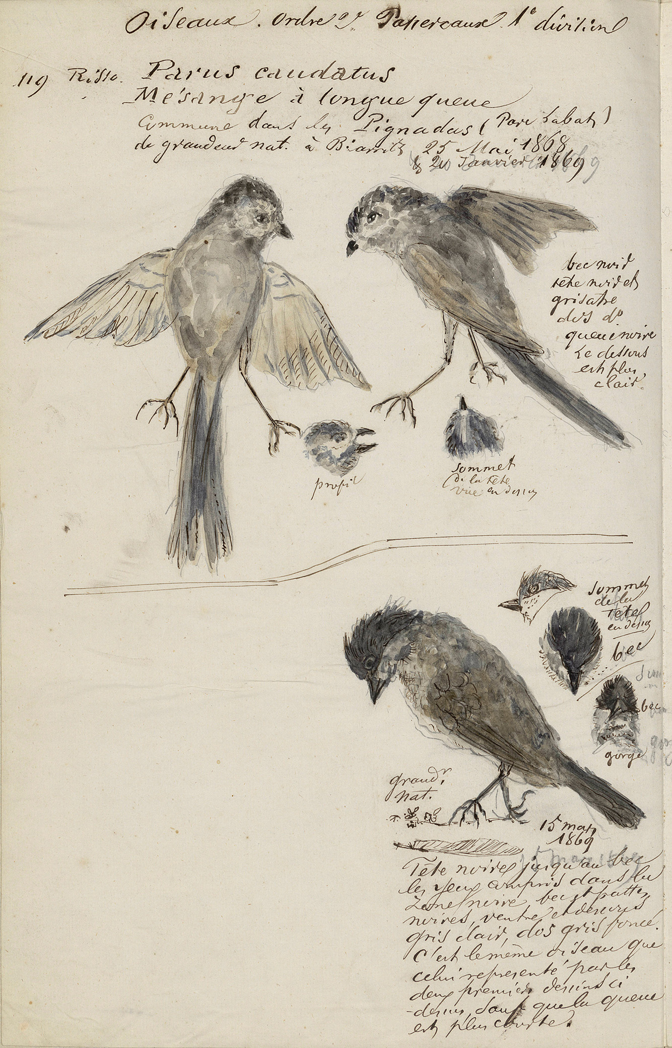 Tête noire jusqu’au bec, les yeux compris dans les zones noires, bec et pattes noires, ventre et dessus gris clair, dos gris foncé. C’est le même oiseau que celui représenté par les deux premiers dessins ci-dessus, sauf que la queue est plus courte.