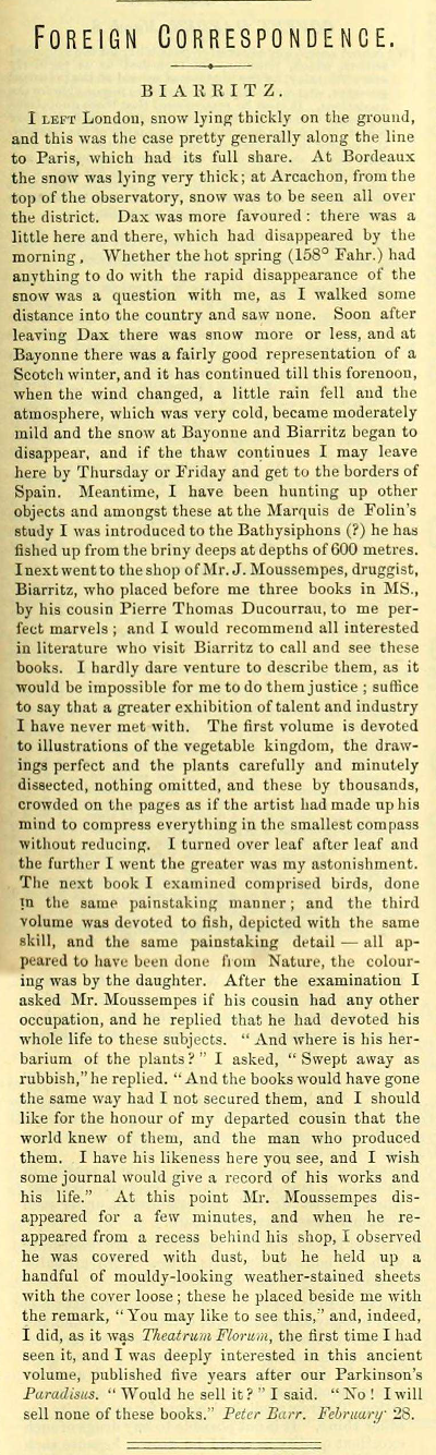 J’ai quitté Londres, une épaisse couche de neige sur le sol, et ce fût quasiment le cas tout le long de la ligne jusqu’à Paris, qui était aussi enneigée. A Bordeaux la couche de neige était épaisse ; à Arcachon, depuis le haut de l’observatoire, on pouvait voir de la neige sur tout le quartier. Dax était plus favorisée : il y en avait un peu ici et là et elle avait disparu le matin. Savoir si le printemps chaud (158° Fahr. ) avait quelque chose à voir avec cette rapide disparition de la neige fût une question pour moi, alors que je parcourais une bonne distance dans la campagne et que je n’en voyais pas. Rapidement après avoir quitté Dax il y avait plus ou moins de neige, et à Bayonne on avait une plutôt bonne représentation de l’hiver écossais. Cela continua jusque dans la matinée, quand le vent changea, une petite pluie tomba et l’atmosphère, qui était très froide, devint relativement douce et la neige à Bayonne et Biarritz commença à disparaître, et si le dégel continue je pourrais partir jeudi ou vendredi et arriver à la frontière espagnole. En attendant, j’ai été à la recherche d’autres objets et parmi eux, à l’étude du Marquis de Folin, j’ai découvert le bathysiphons qu’il a pêché dans les profondeurs salées, à 600m de fond. J’ai ensuite été au magasin de Mr. J. Moussempes, pharmacien à Biarritz, qui a placé devant moi trois livres manuscrits de son cousin Pierre Thomas Ducourrau et qui sont pour moi de pures merveilles. Je recommanderais à tous ceux qui sont intéressés par la littérature et qui visitent Biarritz d’appeler et de voir ces livres. Je n’ose me risquer à les décrire, car il me serait impossible de leur rendre justice ; il suffit de dire que c’est une des plus grandes démonstrations de talent et de travail que je n’ai jamais rencontré. Le premier volume est consacré aux illustrations du règne végétal, de parfaits dessins, avec des plantes attentivement et minutieusement disséquées. Rien n’est oublié, et celles-ci sont entassées par milliers sur des pages comme si l’artiste avait souhaité tout compresser sur la plus petite étendue sans rien réduire. J’ai tourné feuille après feuille et plus j’avançais plus grand fût mon étonnement. Le livre que j’ai examiné ensuite comprenait des oiseaux, réalisés avec la même minutie ; et le troisième volume était consacré aux poissons, décrits avec le même talent et la même rigueur dans le détail - tout avait l’air d’avoir été fait d’après nature, les couleurs avaient été réalisées par la fille. Après examen, j’ai demandé à Mr. Moussempes si son cousin avait une autre activité, et il répondit qu’il avait dévoué sa vie entière à ces sujets. « Où est son herbier des plantes ? » demandais-je, « Jeté avec les ordures » répondit-il. « Et les livres auraient suivi le même chemin si je ne les avais pas sécurisés, et je souhaiterai, en l’honneur de mon cousin disparu, que le monde ait connaissance de ces oeuvres ainsi que de l’homme qui les a produites. J’ai son portrait ici voyez-vous, et j’espère qu’un journal pourra donner un compte-rendu de ses travaux et de sa vie. » A ce moment-là, Mr. Moussempes disparu quelques minutes, et quand il réapparut d’un renfoncement derrière son magasin, j’observai qu’il était couvert de poussière. Il tenait une poignée de feuilles tâchées par le temps et d’apparence moisie avec une couverture molle ; il plaça ceci devant moi en disant, « Vous pourriez aimer voir ceci », et, en effet, j’appréciais, car c’était Theatrum Florum, que je voyais pour la première fois, et j’étais profondément intéressé par cet ancien volume, publié cinq ans après notre Paradisus de Parkinson. « Le vendrait-il ? » demandais-je. « Non ! Je ne vendrai aucun de ces livres. »