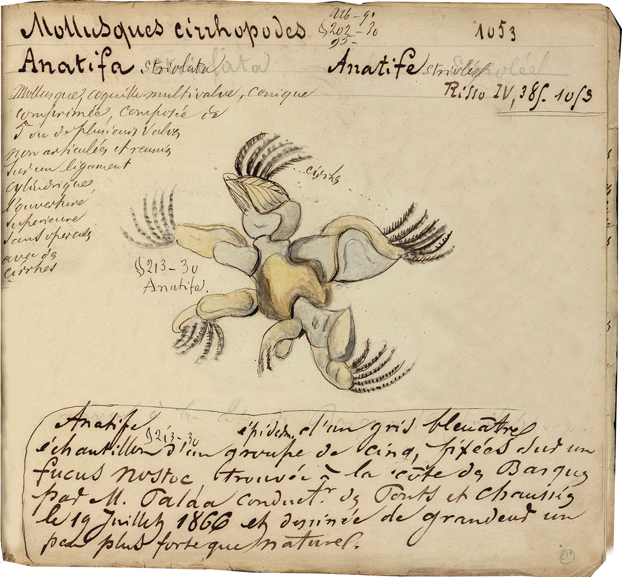 Échantillon d’un groupe de cinq, fixées sur un fucus nostoc, trouvée à la côte des Basques par M. Palda conducteur des Ponts et chaussées le 19 juillet 1866 et dessinée de grandeur un peu plus forte que naturel.