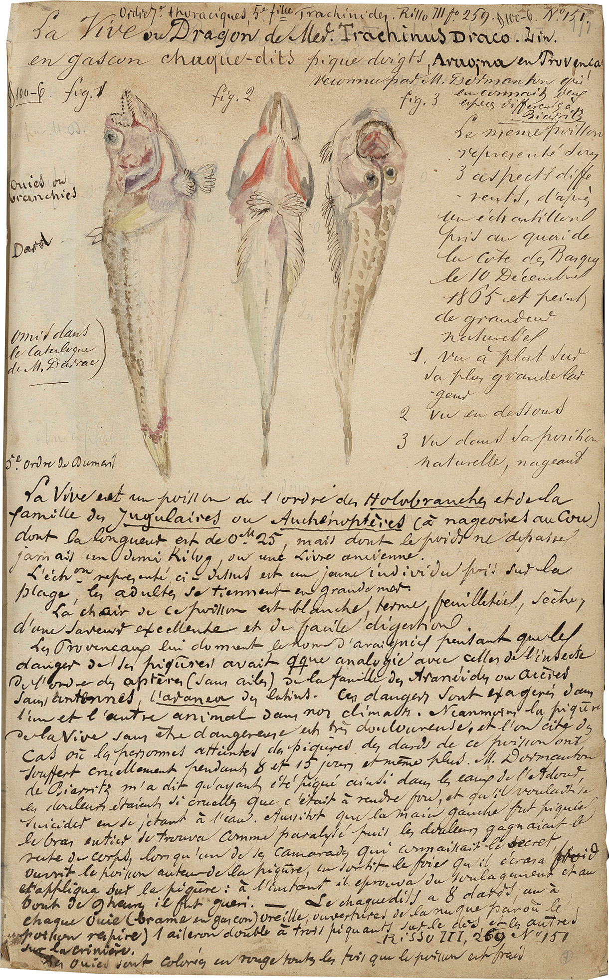 Le même poisson représenté dans 3 aspects différents, d’après un échantillon pris au quai de la Côte des Basques le 10 décembre 1865 et peint de grandeur naturelle