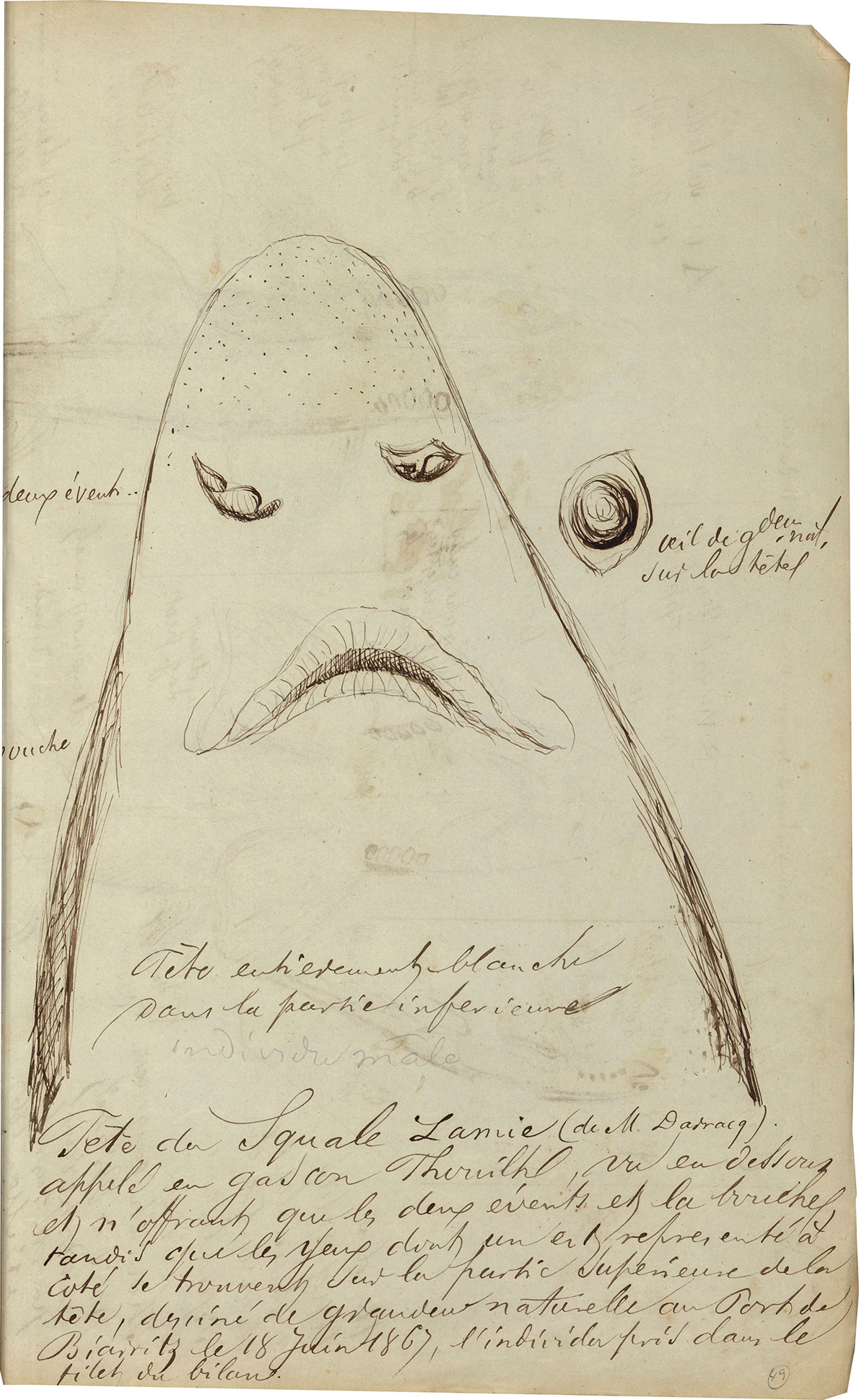 Appelé en gascon Thouilh, vu en dessous et n’offrant que les deux évents et la bouche tandis que les yeux dont un est représenté à côté se trouvent sur la partie supérieure de la tête, dessiné de grandeur naturelle au Port de Biarritz le 18 juin 1867, l’individu pris dans le filet du bilan