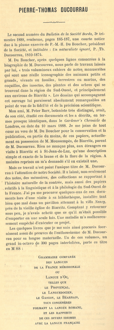 Le second numéro du Bulletin de la Société Borda, 3e trimestre 1888, renferme, pages 185-187, une courte notice due à la plume exercée de P.-M.-H. Du Boucher, président de la Société, et intitulée : Un naturaliste ignoré, P. Th. Ducourrau, 1810-1874.